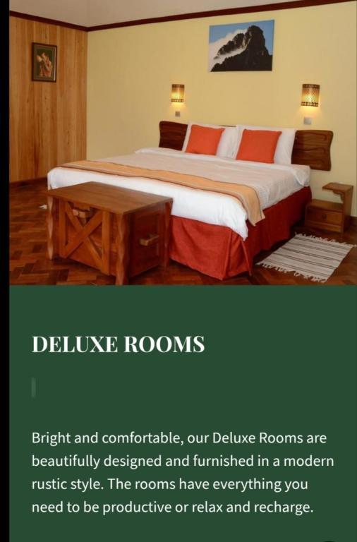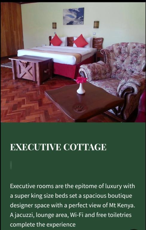 Description: | COMFORT IN A TIMELESS STYLE A private terrace or patio with outside seating and the elegant influence of modern rustic décor are the foundation for each of the luxury accommodation at our hotel. Deluxe Rooms Bright and comfortable, our Deluxe Rooms are beautifully designed and furnished in a modern rustic style. The rooms have everything you need to be productive or relax and recharge. Executive Cottage Executive rooms are the epitome of luxury with a super king size beds set a spacious boutique designer space with a perfect view of Mt Kenya. A jacuzzi, lounge area, Wi-Fi and free toiletries complete the experience Family Suites Family Suites are perfect for your family escapes should you wish to be together with your beloved ones. One enjoys all normal facilities like all Nelion rooms with an interconnecting door. They may sleep a maximum of 2 adults and 3 children 2bd cottage This is a 2 bedroomed family cottage, with a tastefully furnished living room. Both bedrooms are ensuite, and share a large verandah overlooking Mt Kenya. A TV with satelitte channels, mini fridge, coffee/tea amenities table, room safe, hot water bottles are just some of the amenities in this cottage. This is a true home away… |